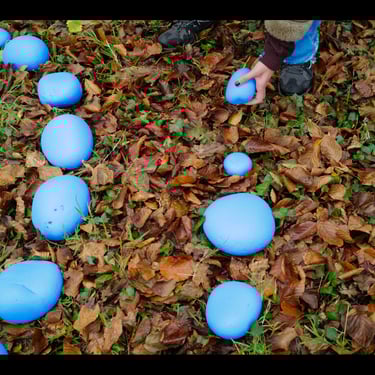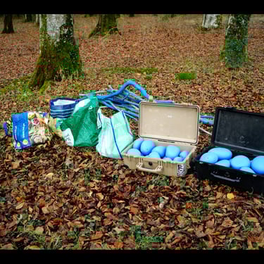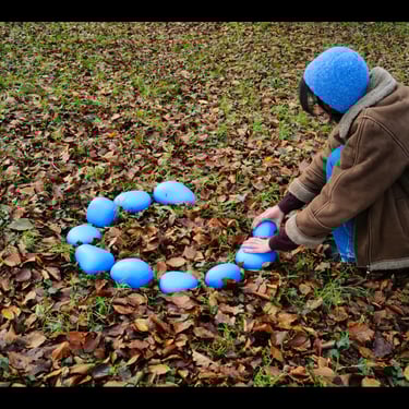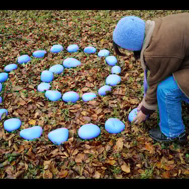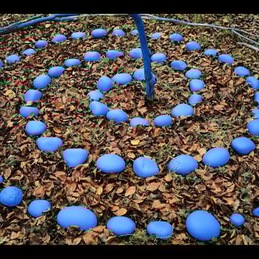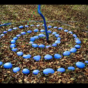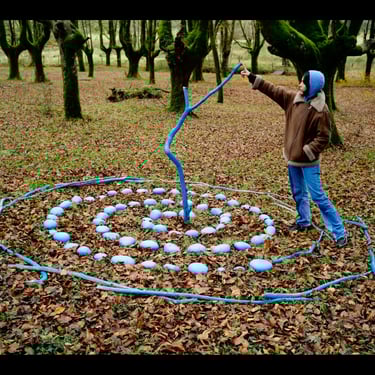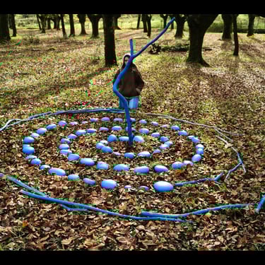 Un sutíl rito de transformación, usando materiales proporcionados por la naturaleza, con piedras y ramas intervenidas con pintura ecológica en forma de espiral, un símbolo tan antiguo como la humanidad.